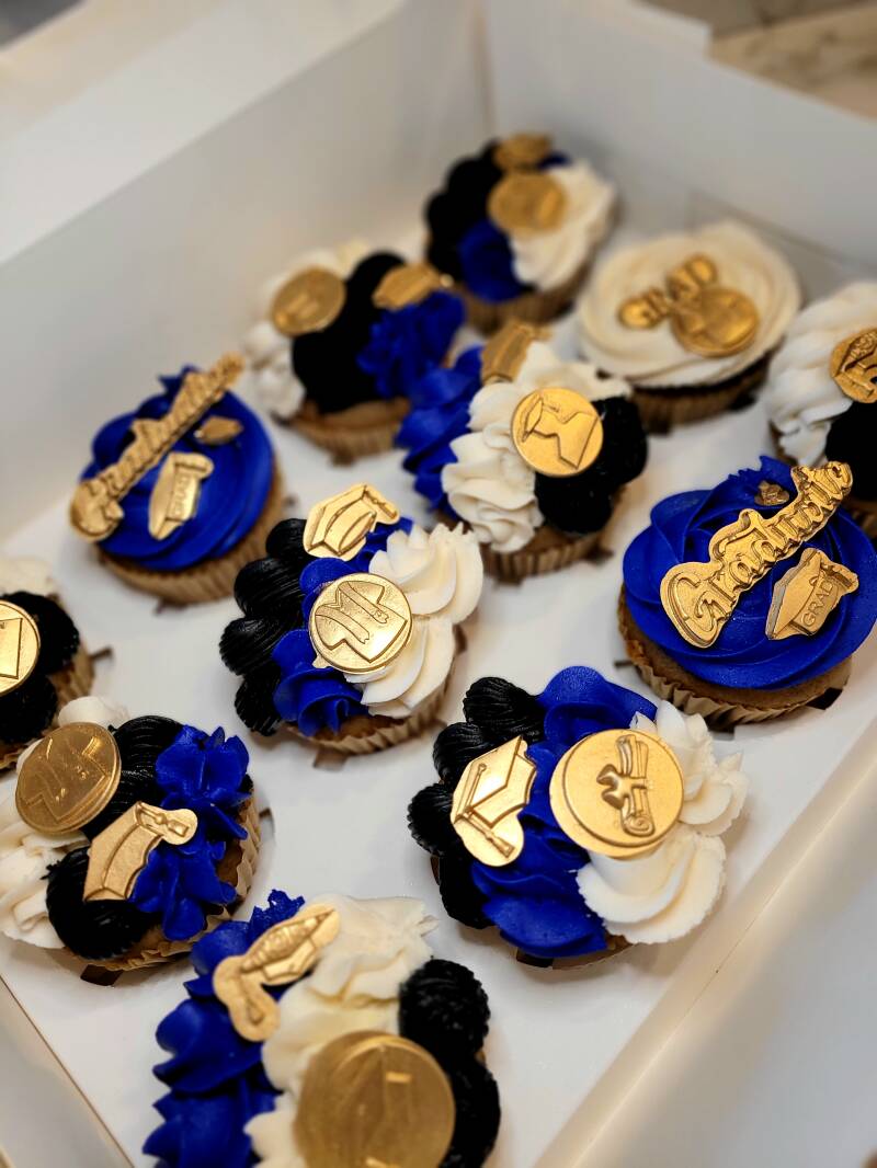 Navy Blue, light blue, gray blue and black rosettes with gold sprinkles and two custom navy roses, filled with vegan cream cheese frosting.